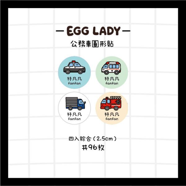 ‼️此為圓形貼賣場‼️ 下單後請在訂單留言處或聊聊備備註姓名 尺寸:寬約2.5cm 一組綜合有四種車車,共有72枚 防水耐刮,可以使用在需洗滌的餐具上 可中文+英文製作 字型固定 款式 公務車, 工程車